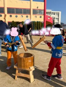 年長組ははっぴを着て、杵を持って、お友達と力を合わせてぺったんぺったんとつきました😆