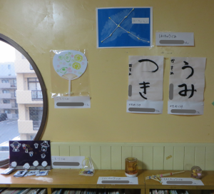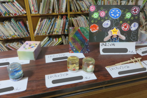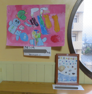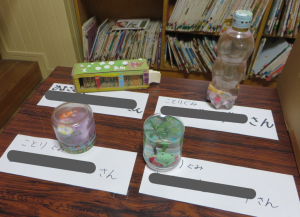 子ども達の描いたイラストとともに色のついた砂を交互に入れました!