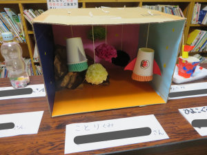 紙皿に毛糸を巻き、花瓶に見立てたカップには